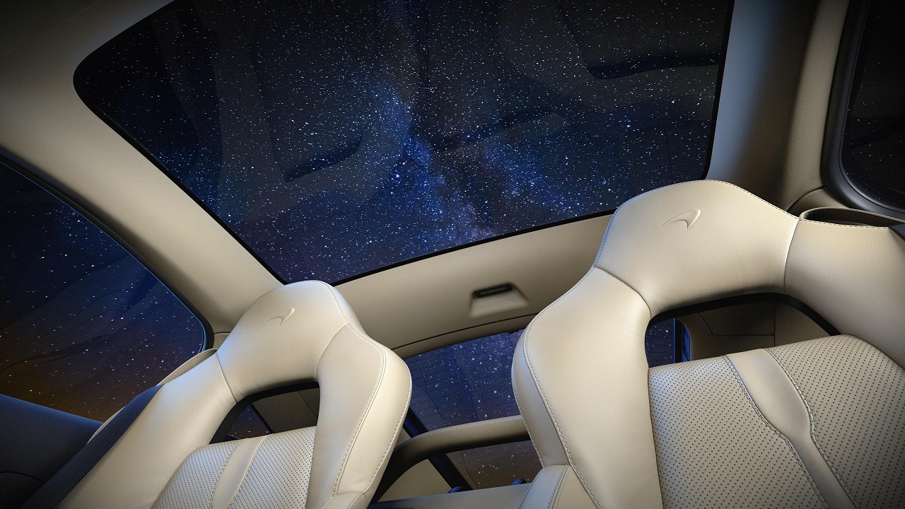 インテリアは、標準装備の固定式ガラスパノラミックルーフ、リヤの大型ガラスハッチまで続く大胆なグラスハウスデザインが、明るく開放的な雰囲気を演出し、マクラーレンモデルのなかでもっともラグジュアリーでリラックスした空間を創出した。