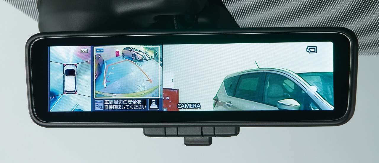 また、スマートルームミラー使用中にスイッチの切り替えで、インテリジェントアラウンドビューの画像をルームミラーに映しだすこともできる。