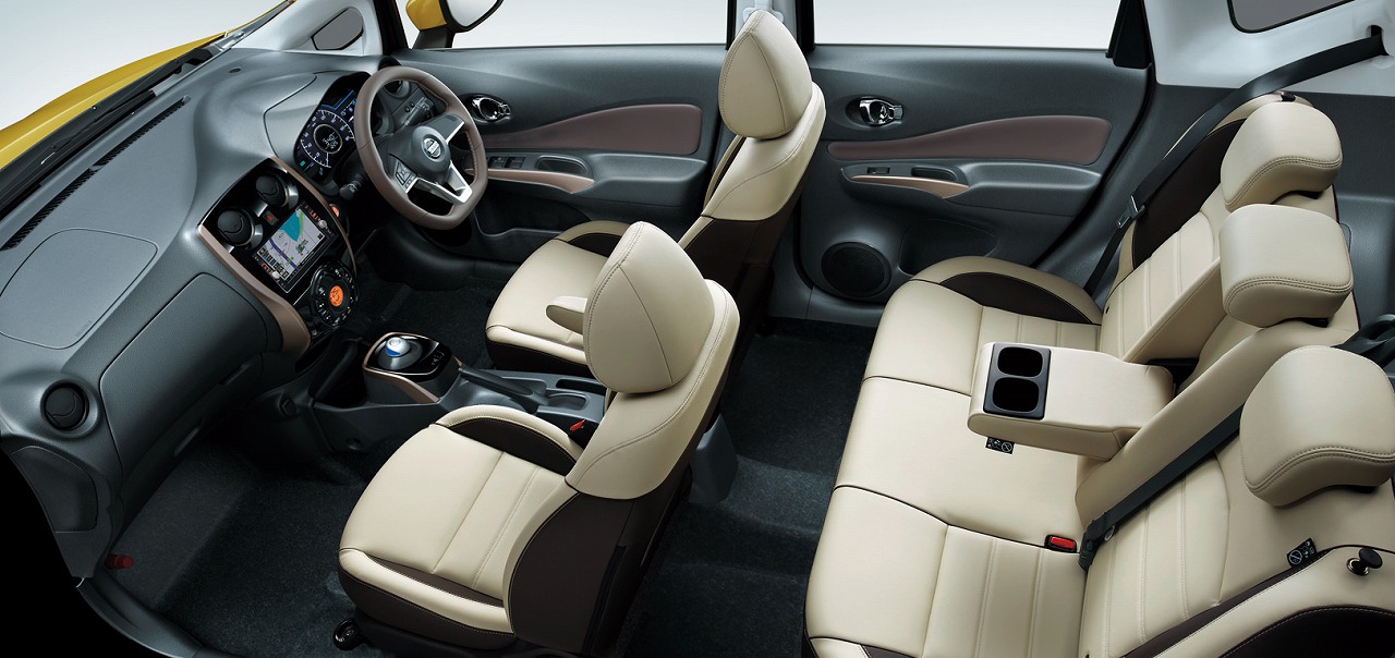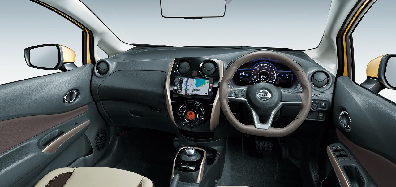 ノート全車においては、内外装に新デザインが採用されたほか、スマートルームミラー(インテリジェントアラウンドビューモニター機能表示付)が追加され、従来からのエマージェンシーブレーキとあわせ安全装備を向上させた。