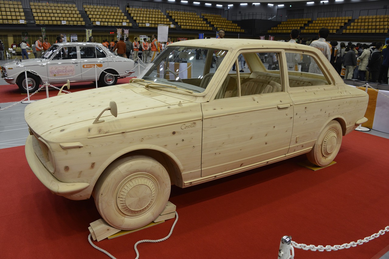 (木製の初代カローラ(左)、タイヤリフトアップ)